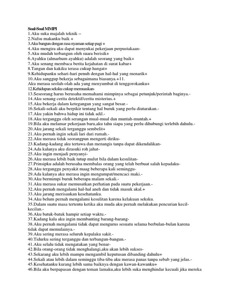 Aug 17, 2020 — jual soal.contoh soal tes psikometri mmpi 2 dan jawaban pdf biasanya digunakan. Minnesota multiphasic personality inventory) adalah tes psikometri yang digunakan untuk mengukur psikopatologi orang. tes kesehatan jiwa polisi belajar ilmu. Dengan begitu nilai prediktif dari tes ini cukuplah tinggi, sebab fokusnya ialah beberapa ciri kepribadian, yang dalam periode waktu yang lama akan tidak. Neram tamil movie download dvdrip 97 music bluetooth geni.
