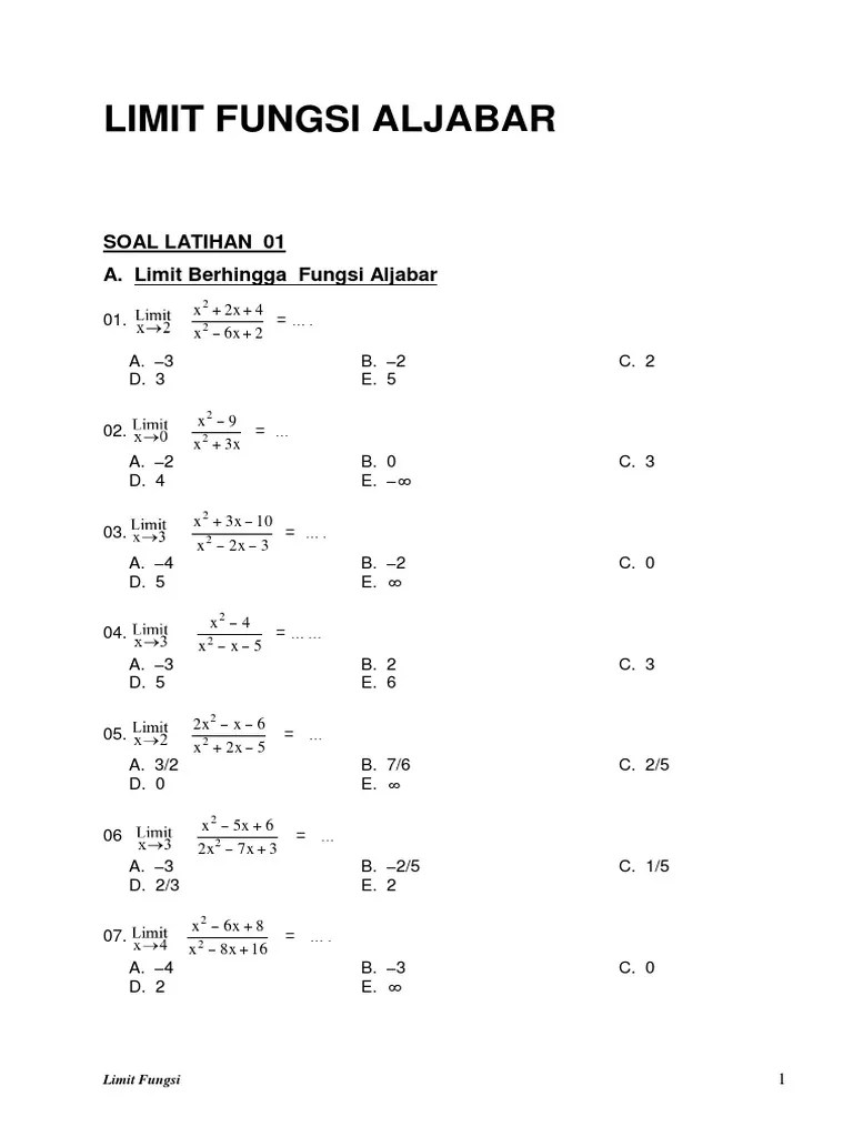 Dikutip dari buku 'cerdas belajar matematika' karya marthen kanginan salah . Contoh soal limit fungsi aljabar membagi dengan pangkat tertinggi. Metode membagi pangkat tertinggi penyebut. 6 tipe soal limit aljabar dan cara jawabnya | mat wajib kls 11#limitfungsialjabar #limitkelas11 #patmatematikawajib6 tipe soal limit fungsi . Soal 12 hitunglah nilai limit fungsi aljabar berikut:.