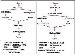 Menunjukkan pergiliran keturunan pada tumbuhan lumut dan paku, untuk menunjukkan fase gametofit dan sporofit.